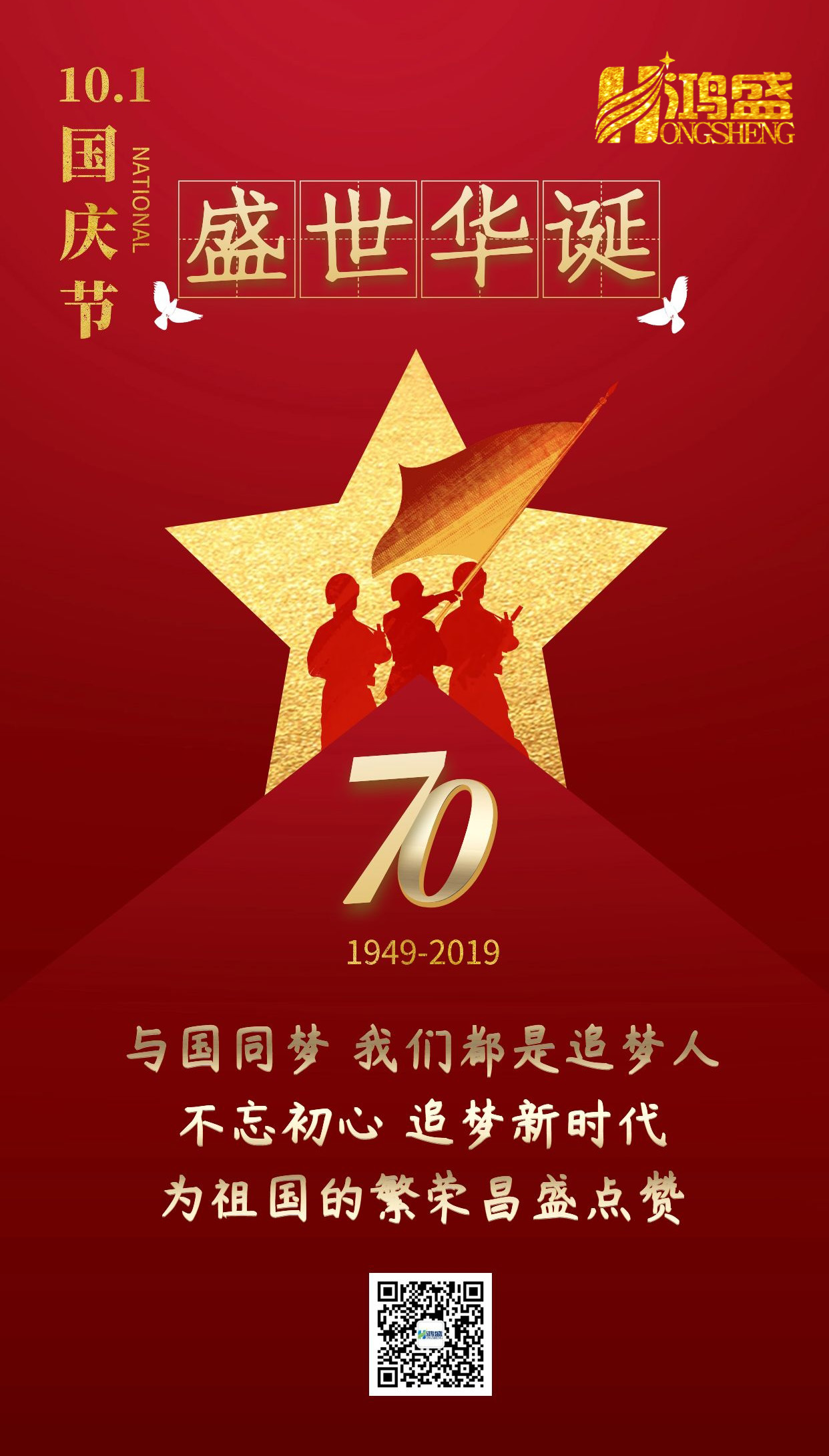 在中华人民共和国成立70周年之际,鸿盛新材全体人员提前预祝大家国庆节快乐!也在此向我们越来越强大的祖国以及每一位老一辈革命家致以最高的敬礼!...